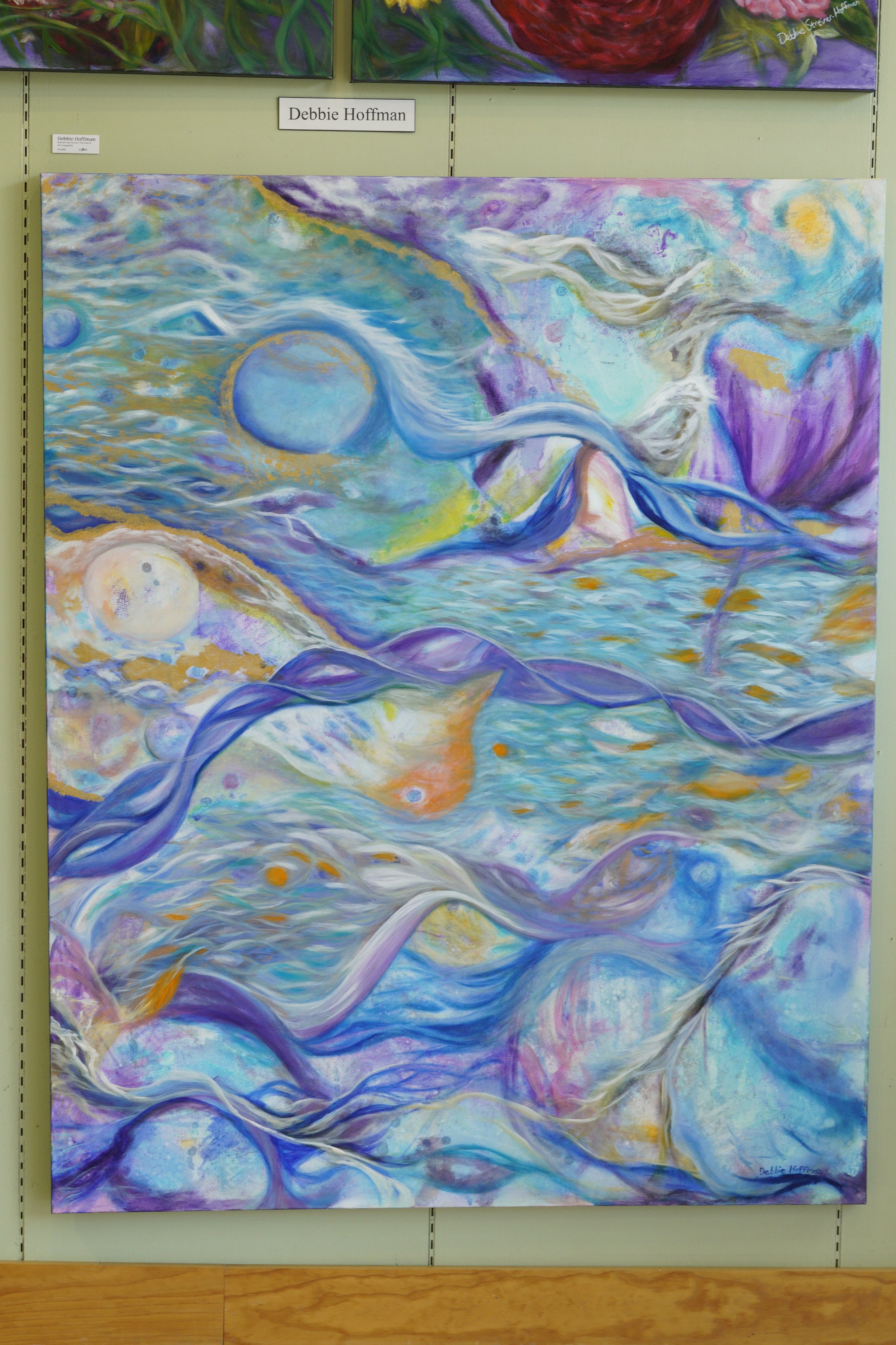 “Beneath the Surface: The Search for Tranquility” is 48” x 60” mixed media (acrylic, oil, gold leaf) painting.